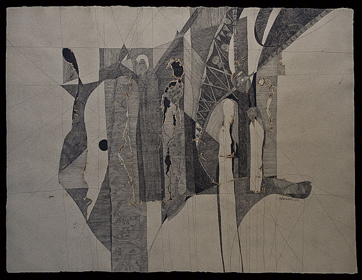 Federzeichnung Handzeichnung Mischtechnik Feder -Tusche auf handgeschöpftem Bütten Ölmalerei Öl auf Leinwand Lasurmalerei Holzschnitt Holzschnitt vom verlorenen Druckstock Hochdrucktechnik Materialdruck Frottage
