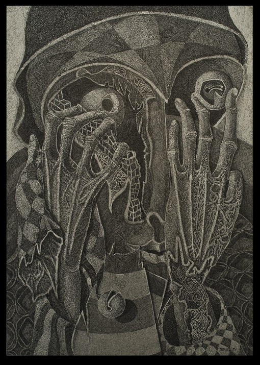 Federzeichnung Handzeichnung Mischtechnik Feder -Tusche auf handgeschöpftem Bütten Ölmalerei Öl auf Leinwand Lasurmalerei Holzschnitt Holzschnitt vom verlorenen Druckstock Hochdrucktechnik Materialdruck Frottage